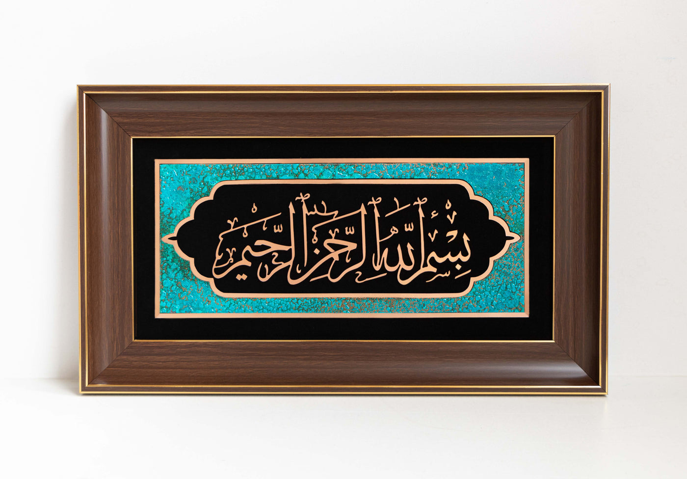 The warm copper-metallic lettering beautifully contrasts against the deep black velvet background, while delicate turquoise arabesque motifs adorn the four corners, evoking the timeless elegance of Persian-Islamic artistry and inviting barakah into any space.